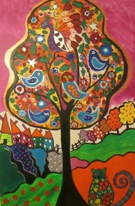 Animal paintings > Quirky Cat and a quirky Bird Tree