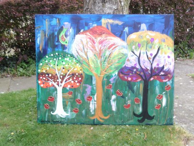 A very original and colourful fantasy tree painting of colourful trees and dancing red poppies in the foreground against an abstract background. The painting is painted in acrylics, three dimensional acrylics and some glitter on one of the trees on a canvas . The painting is painted around the sides in blue ready to hang on the wall or it can be framed if preferred