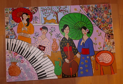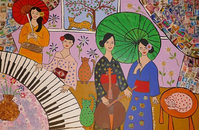 > Japanese Geisha, a Piano, Cello and Colourful Cats