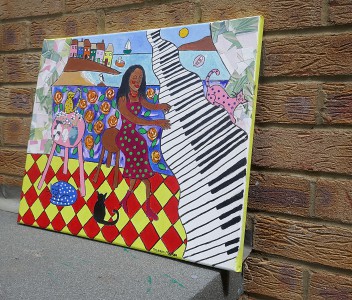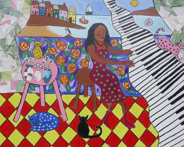 This colourful folk art painting is painted in acrylics on canvas and I have also used cut up pieces of pretty wall paper which I have stuck on to the canvas. The painting is from a series of piano and cat paintings which have been very popular in the past. I have done several variations over the years and they have proved to be very popular. Painted around the sides and ready to hang on the wall or it can be frame if preferred. Free postage throughout the UK. Please ask for postage price outside the UK. It will be well wrapped for delivery.