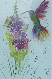 Humming bird, bumble bee and foxglove