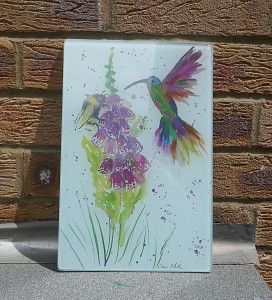 This hummingbird and foxglove design on a a glass chopping board is from my orignal watercolour painting. Easy to wipe and the price includes delivery to the uk. It will be well wrapped when posted.