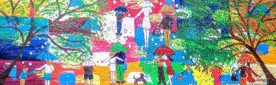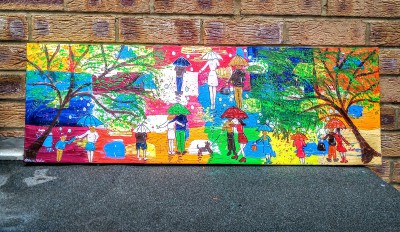 I love painting colourful umbrella paintings and this one against a rainbow coloured background is certainly in tune with todays corvid 19 pandemic and the significance of the rainbow which has been used a lot throughout the pandemic. Rainbow signifying Hope. The painting of colourful umbrellas against this rainbow coloured background with large raindrops is painted around the sides and can be hung straight on the wall or it can be framed if preferred