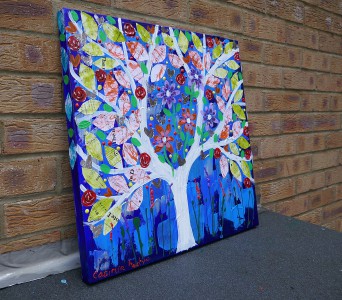 Painted on canvas in acrylics and painted sheet music for the leaves. This painting full of colourful flowers is painted in blue around the sides ready to hang on the wall and measures