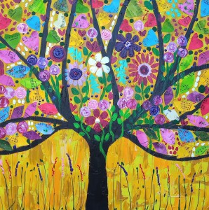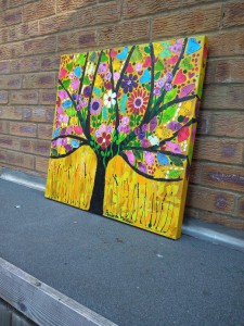 Size 22" x 22" This Colourful and naive tree of life painting is painted in acrylics and mixed media on canvas. The leaves and hearts are made from painted sheet music. The painting is painted around the sides ready to hang on the wall or it can be framed if preferred
