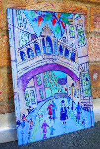 This glass chopping board is designed from my original artwork of a mixed media painting of the Bridge of Sighs in Oxford and measures 20cm x 28 cm. Free postage thoughout the UK only