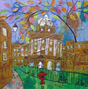 The canvas has initially been layered with newspaper and moulding plaster cloth and painted over in acrylics with splashes of ink. I have also used painted over maps for the leaves on the tree by the Bridge of Sighs in Oxford where The white Rabbit is looking at his watch from Alice in Wonderland. I have also used stamps for the pavement The painting is painted around the sides ready to hang. I have also used imitation copper leaf on the building.