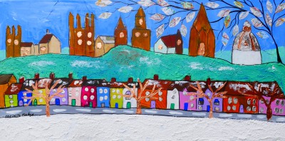 This quirky, naive painting of London Place in the South of Oxford isof particular interest to me as a subject and place as I partly grew up here often staying with my grandmother while at college as she lived in London place along with other family members in various of the Victorian attached houses. This is a painting of a winter scene with snow using mixed media on canvas. I have used cut out map music for the leaves of the tree as well as imitation copper and silver leaf for the windows and bear trees at the from. There is a rich rough texture for the snow. The painting is painted around the sides ready to hang or it can be framed if preferred.